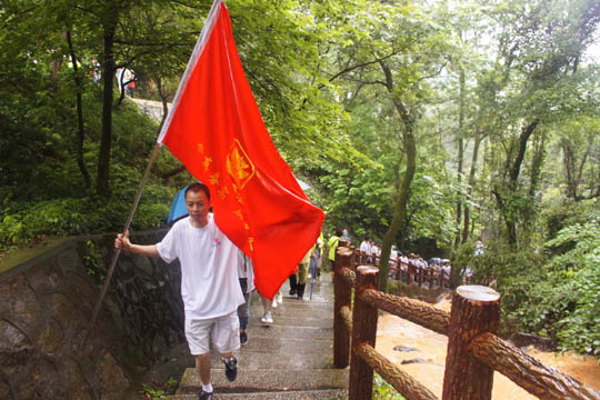 6月7日上午8点半,所有参赛团队到达阁皂山山门口,但由于比赛现场突然下起倾盆大雨,市体育局决定将比赛延期。但幸运的是,上午9点天气又突然雨转多云,于是四特伙伴们决定继续攀登阁皂山!四特伙伴们统一穿着印有“求真务实 从容久远”的企业文化衫,在厂旗的带领下,一同向阁皂山主峰进发。整个团队也立刻成为阁皂山一道靓丽的风景。