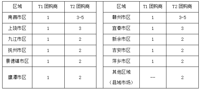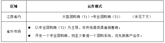 江西省内以单元市场为划分,通过大型团购商(T1)+专业团购商(T2)相结合的模式进行产品导入及市场渗透: