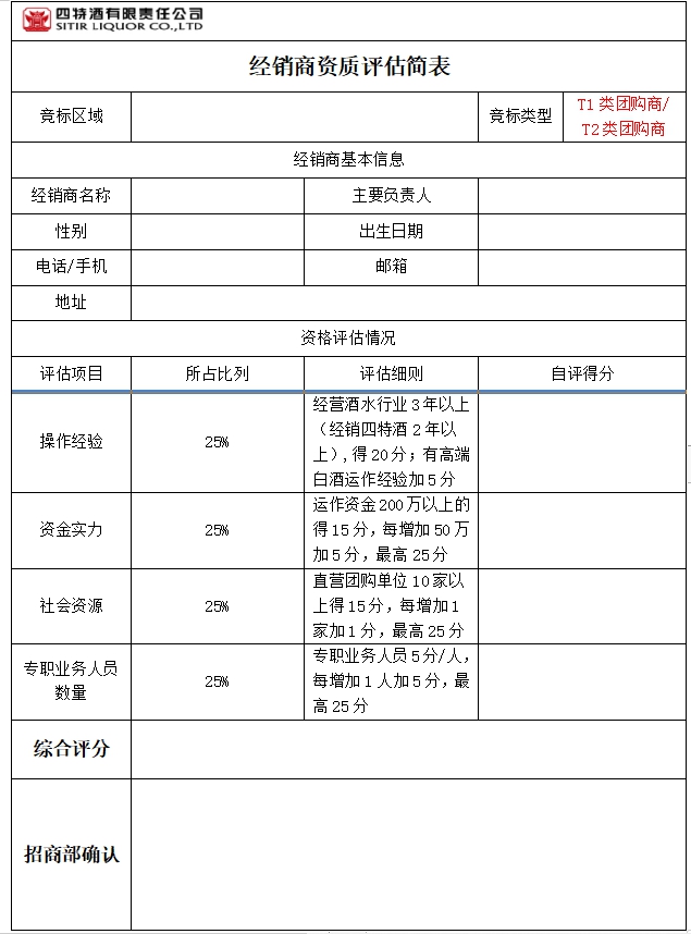 1、竞标方填写一份《经销商资质评估简表》(见附件);